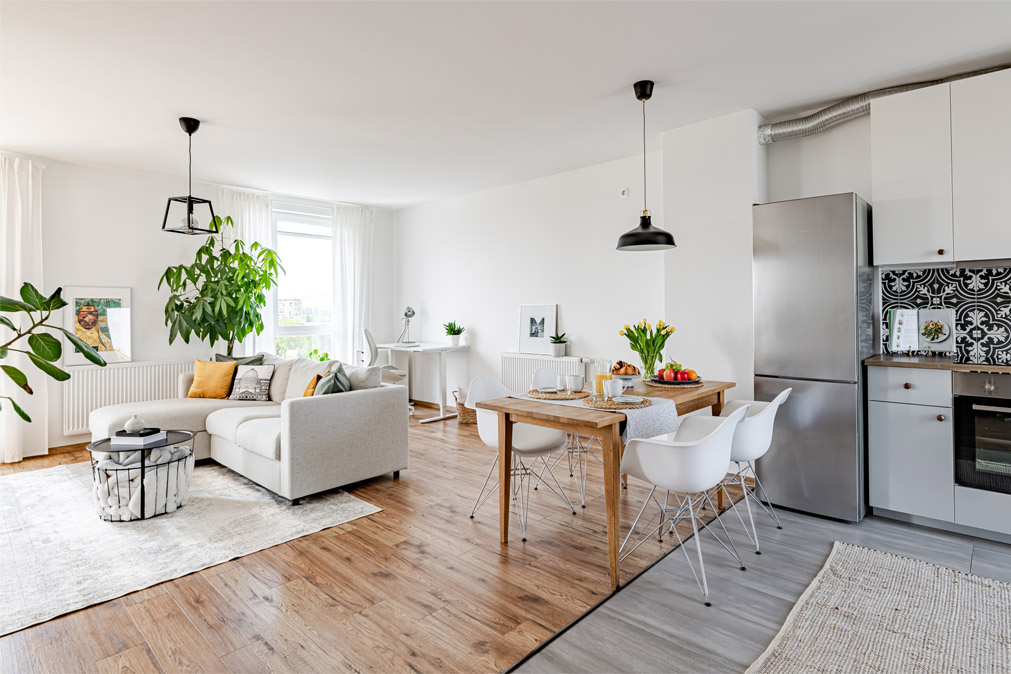 A felkészítés célja az volt, hogy a lakásban található bútorokkal bemutassam a terek ideális funkcióit, valamint a textilekkel és dekorációkkal otthonos hangulatot teremtsek a helységekben. A hatalmas, napfényes nappali a méretéből adódóan alkalmas rá, hogy kialakítsunk egy szeparált, mégsem elzárt dolgozó-állomást - ennek megléte az aktív korú célcsoportunknál szinte követelmény!